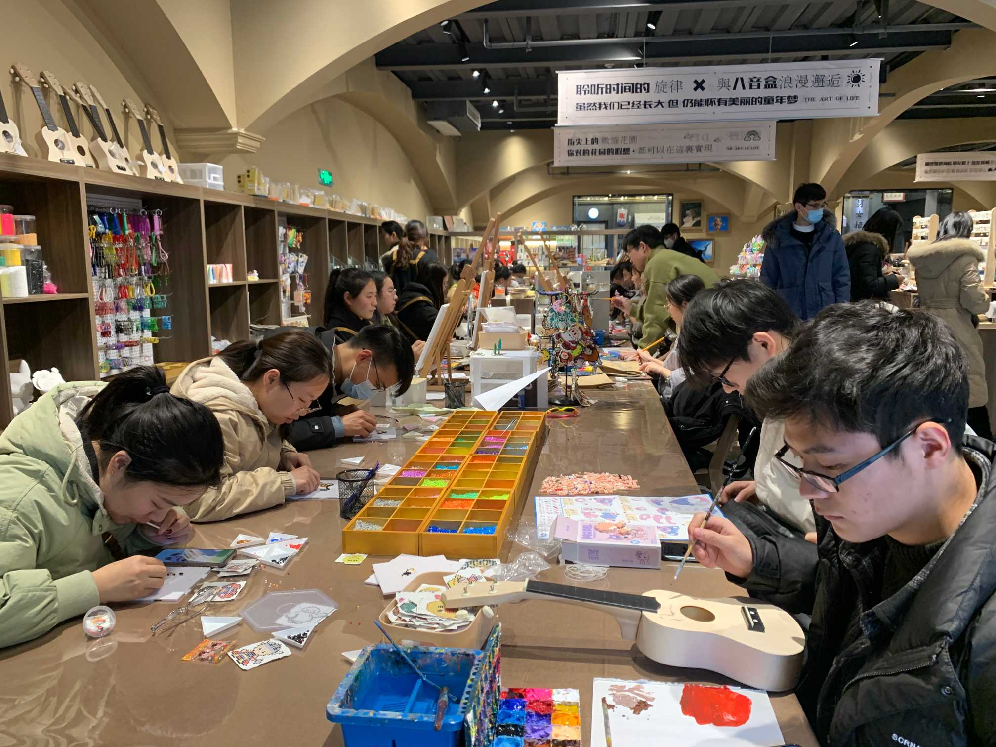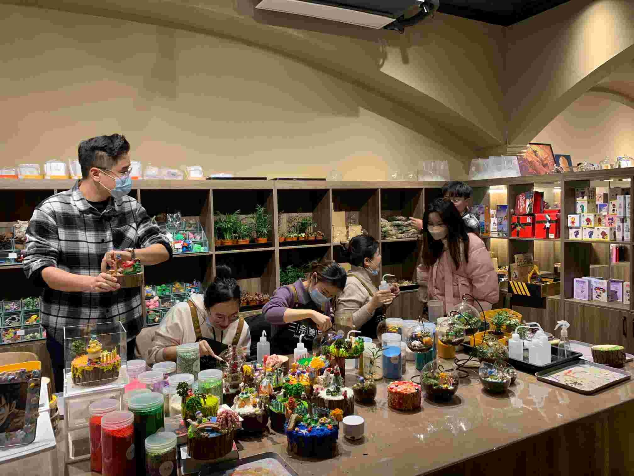 當日下午大家暫時放下手頭的工作,饒有興趣地參加到精彩紛呈的DIY活動中來,近40位小伙伴們一起制作,沉浸在手作的樂趣中。咱們的DIY種類繁多,有繪畫、微型景觀、奶油文具盒、八音盒、香薰蠟燭、拼豆、尤克里里等,每一項DIY項目都排起了長長的隊伍,大家玩的不亦樂乎。